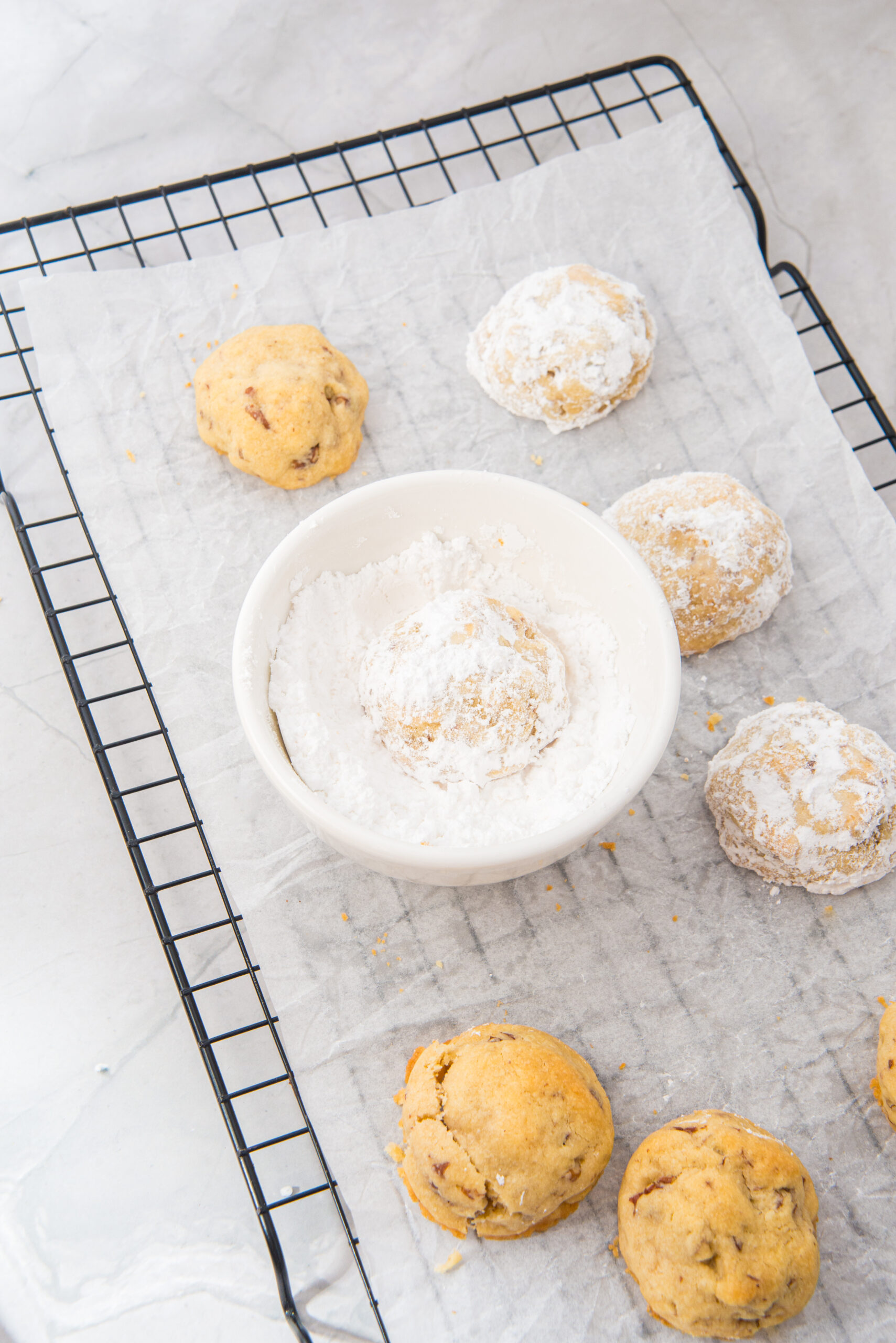 ● Cooling: Let the cookies cool completely before rolling them in powdered