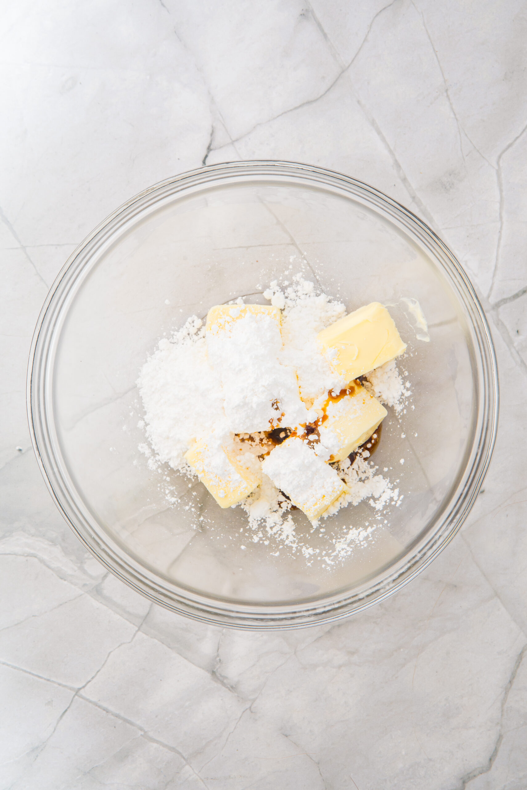 - In a large bowl, beat the butter with the powdered sugar and vanilla extract until you have a smooth, creamy mixture.