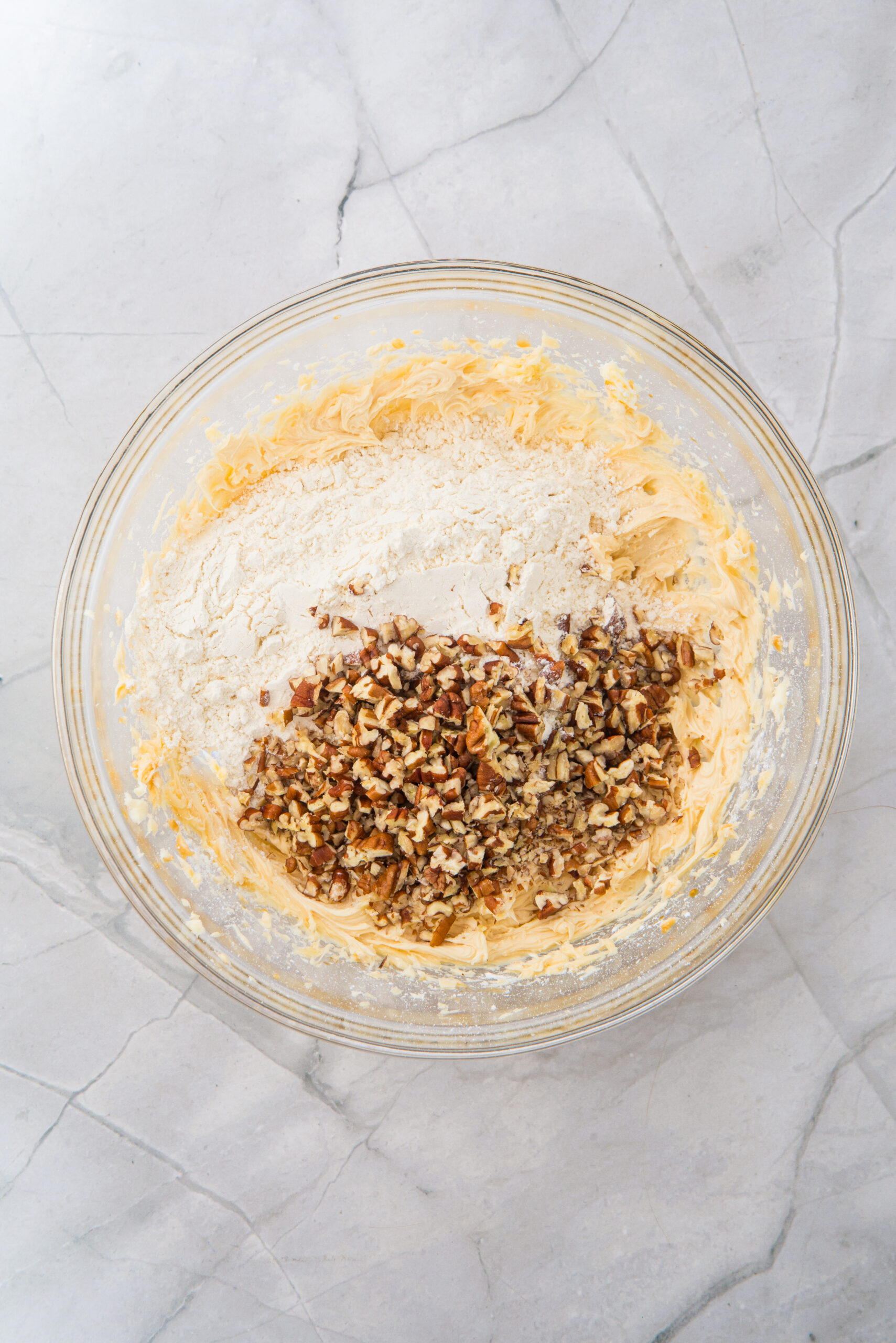 - Add the flour and chopped pecans directly to the bowl. Mix with a spatula until all the ingredients are well combined.