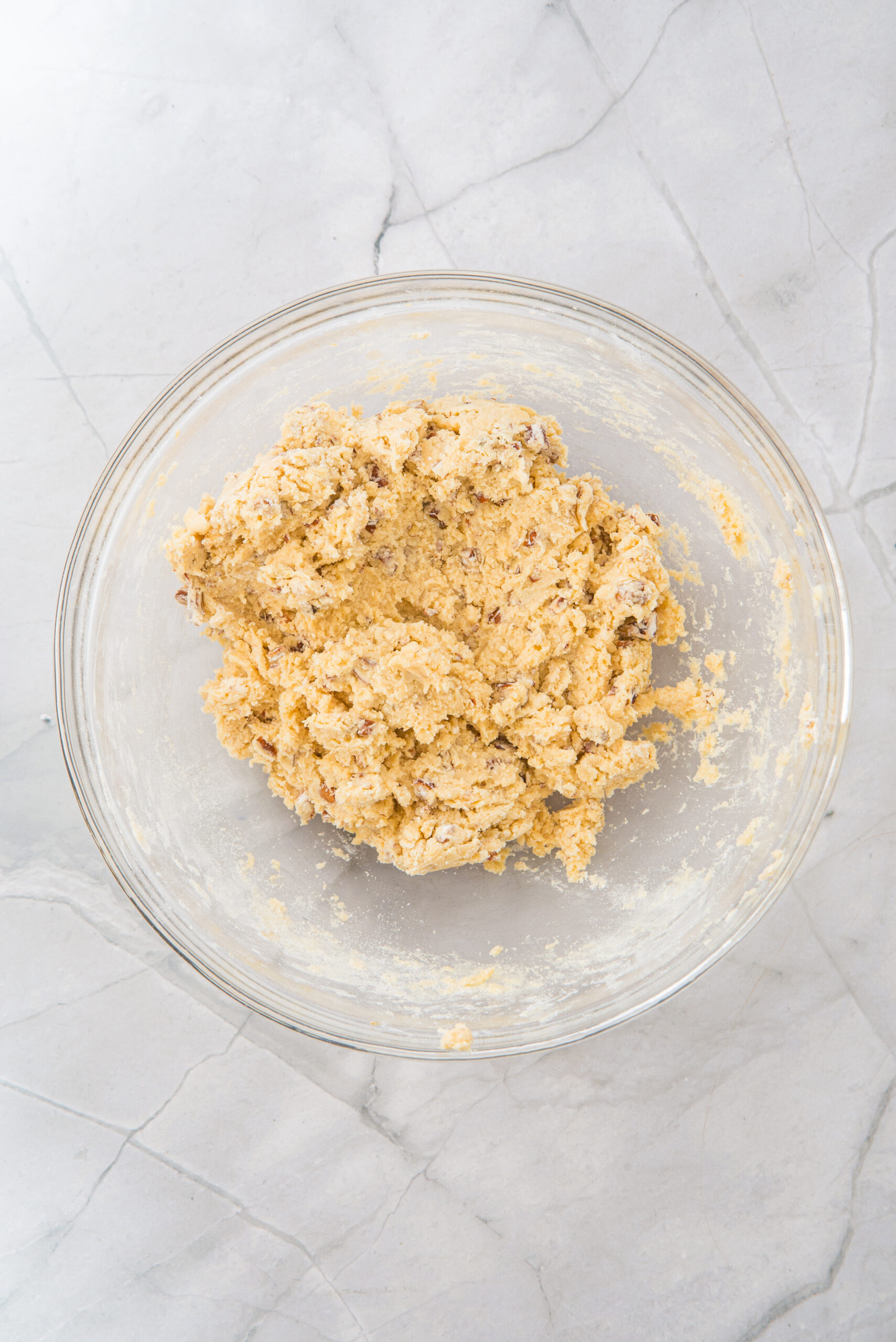 2: Add the flour and chopped pecans directly to the bowl. Mix with a spatula until all the ingredients are well combined.