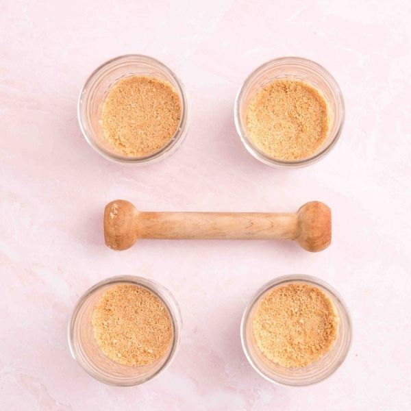 Add divided graham cracker crumbs into the bottom of 4 jars. Use a tamper to press down on crumbs.
